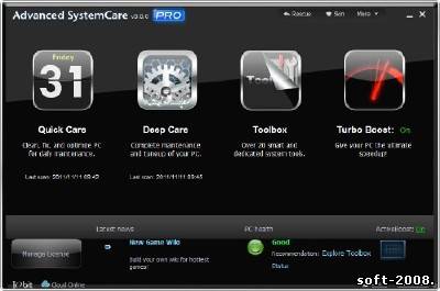 Advanced SystemCare Pro - набор утилит для оптимизации системы. Проводит анализ системы, после чего производит оптимизацию системной конфигурации, в том числе изменяет на оптимальные настройки безопасности, удаляет из системы Spyware и Adware, исправляет ошибки в системном реестре, удаляет временные файлы, оптимизирует параметры интернет-соединения, позволяет управлять автозагружаемыми приложениями, производит дефрагментацию файловой системы и т.д. и т.п. Благодаря возможностям данной программы вы сможете очистить ваш компьютер от шпионского и рекламного ПО, обнаружить и заранее устранить возможные угрозы и бреши в системе безопасности ОС. Профессиональная версия программы обладает полной функциональностью, в отличии от бесплатной версии этой утилиты. Отличия профессиональной версии заключаются в более тонкой и эффективной оптимизации системы, в возможности автоматического обновления программы и её запуска по расписанию. Интерфейс программы переведен на множество языков, включая русский. Благодаря возможностям данной программы вы сможете очистить ваш компьютер от шпионского и рекламного ПО, обнаружить и заранее устранить возможные угрозы и бреши в системе безопасности ОС, исправить ошибки в системном реестре, очистить временные и ненужные файлы, управлять списками автозагрузок, оптимизировать работу системы. Особенности: - Увеличение производительности и надежности системы - Мощная дефрагментация и оптимизация жестких дисков - Очистка и оптимизация системного реестра - Автоматическая работа в фоновом режиме - Защита системы от шпионского и вредоносного ПО - Быстрая и полная очистка жестких дисков от мусора - Улучшение работы вашего ПК - Исправление множества системных ошибок - Многоязычный интерфейс, включая русский язык. []  [/] Размер: 26 Мб Информация на восстановление: +1% Язык Интерфейса: Multilanguage(Русский) Лекарство: в архиве Платформа: Windows 2000/2003/XP/Vista/ 7 Cкачать Advanced SystemCare Pro 5.3.0.245 DC 28.05.2012 :