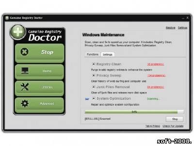 Genuine Registry Doctor - многофункциональная программа для очистки, оптимизации и исправления ошибок реестра операционной системы Windows. Программа позволяет удалять устаревшие записи из реестра и временные файлы Windows, очистить историю веб-браузера (только для Internet Explorer), есть возможность поиска дубликатов файлов и функция сканирования жесткого диска на наличие ошибок. Особенности: Всегда обеспокоивший низкими скоростями, внезапными катастрофическими отказами и набором погрешностей? Почему бы не фиксировать все системные ошибки и зондировать обширный потенциал вашего PC и обладают более безопасной сетевой средой? С Genuine Registry Вспомогательный механизм, вы только нуждаетесь в нескольких щелчках, чтобы выполнить это! Это диагностирует погрешности всей вашей системы и дает вам самую профессиональную обработку. Таким образом вы не должны взять боль, чтобы потратить большую сумму денег на фиксацию или переустановить Windows. Особенности устройства: - Твердое сканирование и фиксирует Полностью отсканируйте всю систему и диагностируйте проблемы реестра, конфиденциальности, разберите файлы и систему. Genuine Registry Doctor предлагает вам способ фиксировать все погрешности и оптимизировать Систему программирования. - Полифункциональный Много встроенных утилит, таких как менеджер по Запуску, Очиститель Диска, Распылитель Файла, и т.д., строго улучшают производительность Genuine Registry Вспомогательный механизм. Вы только нуждаетесь в одном малом бесплатном приложении, чтобы иметь все полезные функции. - Удобный для пользователя Очень гладкая загрузка и установка, чистый и организованный скважиной интерфейс, легкая для понимания навигация делает Genuine Registry Doctor чрезвычайно легким обработать даже для новичков. - 100 %, свободных и безопасных Genuine Registry Doctor хотел бы позволить пользователям наслаждаться бесплатным программным обеспечением, чистой и безопасной средой PC. Нет никакого бесплатного ПО с размещенной в нем рекламой, никакого шпионящего ПО, никаких вирусов в этом, и это никогда не будет подводить вас. предохранение его умным автоматическим поиском и функцией развертки.