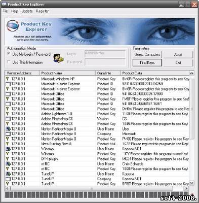Product Key Explorer - программа позволяет расшифровать, увидеть и сохранить серийные номера продуктов Microsoft, CD-ключи установленных на компьютере программ, и не только их. Неполный список ПО, регистрационные данные которых можно увидеть и сохранить: Microsoft Windows (2000, XP, 2003, Vista), Microsoft Office 2003, Microsoft Office 2007, Microsoft Office XP, Microsoft Visual Studio 2005, Agnitum Outpost Firewall, Macromedia, Ahead Nero, Adobe Photoshop, CyberLink PowerDVD, Borland Delphi, Alcohol 120% и т.д. (поддержка более 500 программ). После запуска программы достаточно будет нажать кнопку поиска ключей и она сама просканирует реестр, и выдаст список программ, установленных на компьютере и регистрационные данные к нем. В программе есть окно для авторизации Администратора, если установлены ограничения на уровне пользователей. Может работать по сети с другими компьютерами и по заданному диапазону IP адресов или по списку IP в текстовом документе. Особенности: • Позволяет расшифровать, увидеть и сохранить серийные номера и прочую регистрационную информацию для установленных программ на компьютере • Работа по сети с другими компьютерами, по заданному диапазону IP-адресов или по списку IP из текстового документа • Программа поддерживает более 500 программных продуктов для поиска их регистрационной информации • Быстрый поиск, с помощью одного нажатия на кнопку "Find Keys" • Сохранение регистрационной информации в .txt, .csv, .xls, mdb, .html или .xml файлы • Возможность создания резервной копии ключей, с сохранением в REG-файл (файл реестра Windows) • Поддержка выдачи и сохранения ключей для многих компьютерных игр