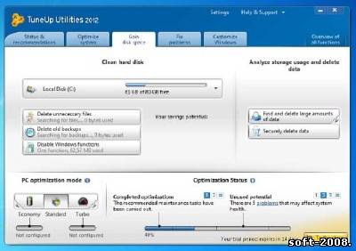 TuneUp Utilities - обновлена свежая версия огромного набора различных инструментов для настройки и оптимизации системы. При поддержки этой программы вы сумеете очищать диски от мусора, удалять неверные записи из системного реестра и дефрагментировать его, оптимизировать оперативную память, управлять автозагрузкой, безвозвратно удалять файлы с диска при помощи специальной утилиты ”TuneUp Shredder” (дальнейшее восстановление становится невозможно даже при помощи специальных программ), восстанавливать удаленные файлы, видоизменять внешний вид Windows, и многое иное. Все утилиты этого пакета объединены в единую графическую оболочку. Для запуска той или иной утилиты нужно выбрать ее название в списке и кликнуть по ней мышкой. После этого открывается диалоговое окно, в котором и производятся все соответствующие действия. Пакет объединяет в себе важные функции для оптимизации системы, конфигурации, очистки и обслуживания в современном графическом пользовательском интерфейсе. Особенности: • Мощный дефрагментатор жесткого диска • Оптимизация запуска системы, ускорение интернета и работы Windows • Быстрая очистка жесткого диска • Эффективная чистка системы от мусора • Полная автоматическая очистка • Эффективная чистка реестра от устаревших и ненужных записей • Эффективная помощь в решении многих проблем в Windows • Эффективное средство для восстановления удаленных данных • Полное удаление данных, без возможности их восстановления • Тонкая настройка Windows • Современный графический пользовательский интерфейс []  [/] Размер: 37,3 Мб Информация на восстановление: +1% Язык Интерфейса: Английский + Русификатор Лекарство: в архиве Платформа: Windows 2000/2003/XP/Vista/ 7 Cкачать TuneUp Utilities 2012 12.0.3010.10 (RUS/ENG):