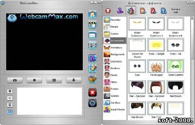 WebCamMax - продвинутая утилита для работы с веб-камерой. Программа, добавляющая изумительные видеоэффекты на все вебкамеры, даже без реальной камеры. Программу можно использовать по умолчанию в таких приложениях, как ICQ, AIM, MSN, Camfrog, Skype, Paltalk, Yahoo, ANYwebcam, Stickam. Можно настроить WebcamMax Full так, чтобы она начинала функционировать и вести трансляцию с камеры только в том случае, когда объектив зафиксирует движение. Доступны более 1000 спецэфектов (на сайте производителя) включая телевизионную заставку, воду, туман, смайлы и т.п., прокрутка текста поверх видео, мягкое переключение между несколькими прямыми передачами и сохраненными образами, использование одной камеры сразу несколькими одновременно запущенными программами, обработка собственного изображения для придачи привлекательности или иных визуальных эффектов. Особенности: Сотни визуальных эффектов для передаваемого видео. Возможность скачивания дополнительных эффектов с сайта программы. Поддержка записи видео с визуальными эффектами. Корректная работа с Windows Live Messenger, Skype, Yahoo Messenger, ICQ, Paltalk, Camfrog, YouTube, Ustream, JustinTV. Поддержка шаблонов для быстрого доступа к любимым эффектам.